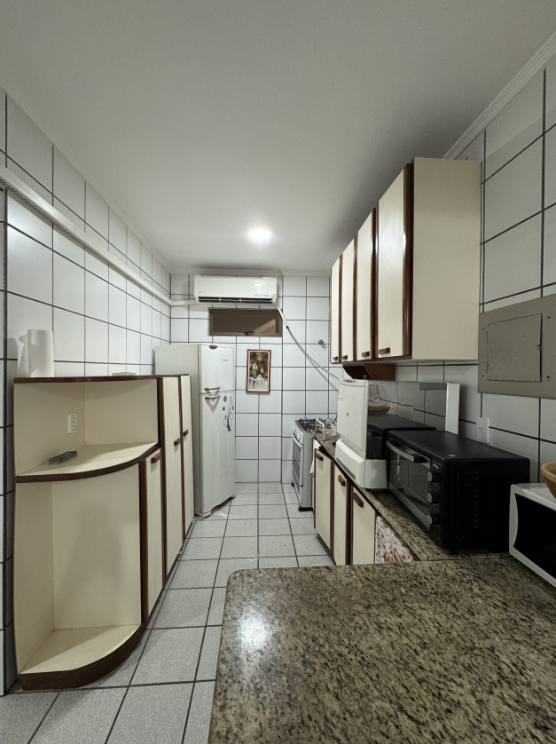 Apartamento na Meia Praia quadra mar, 3 quartos com ar-condicionado, sendo 2 suítes, 50m da praia, 1 vaga de garagem, Três quartos com ar-condicionado, sendo 2 suítes, Sala, Cozinha, Sacada com churrasqueira, Lavanderia com máquina de lavar, Tela de proteção na sacadas e janelas, 1 vaga de garagem, Wi-Fi.